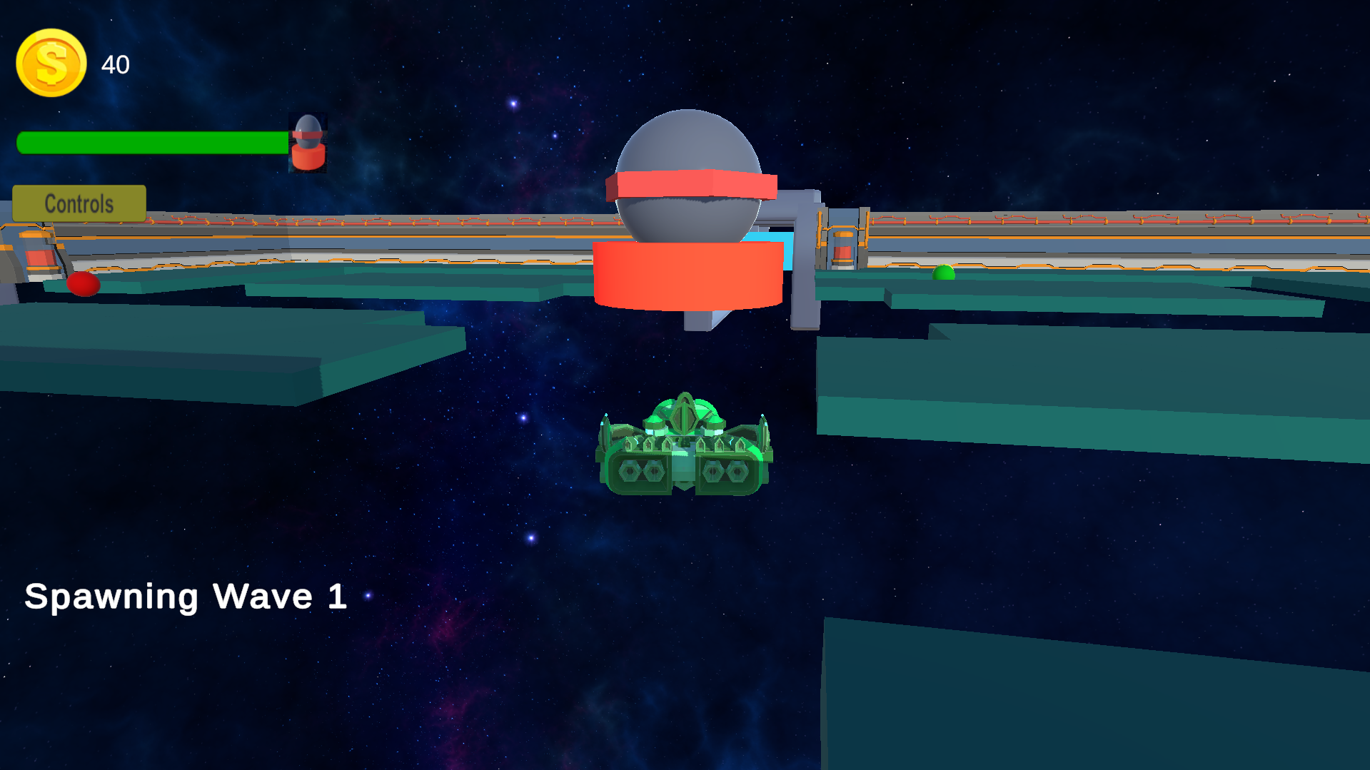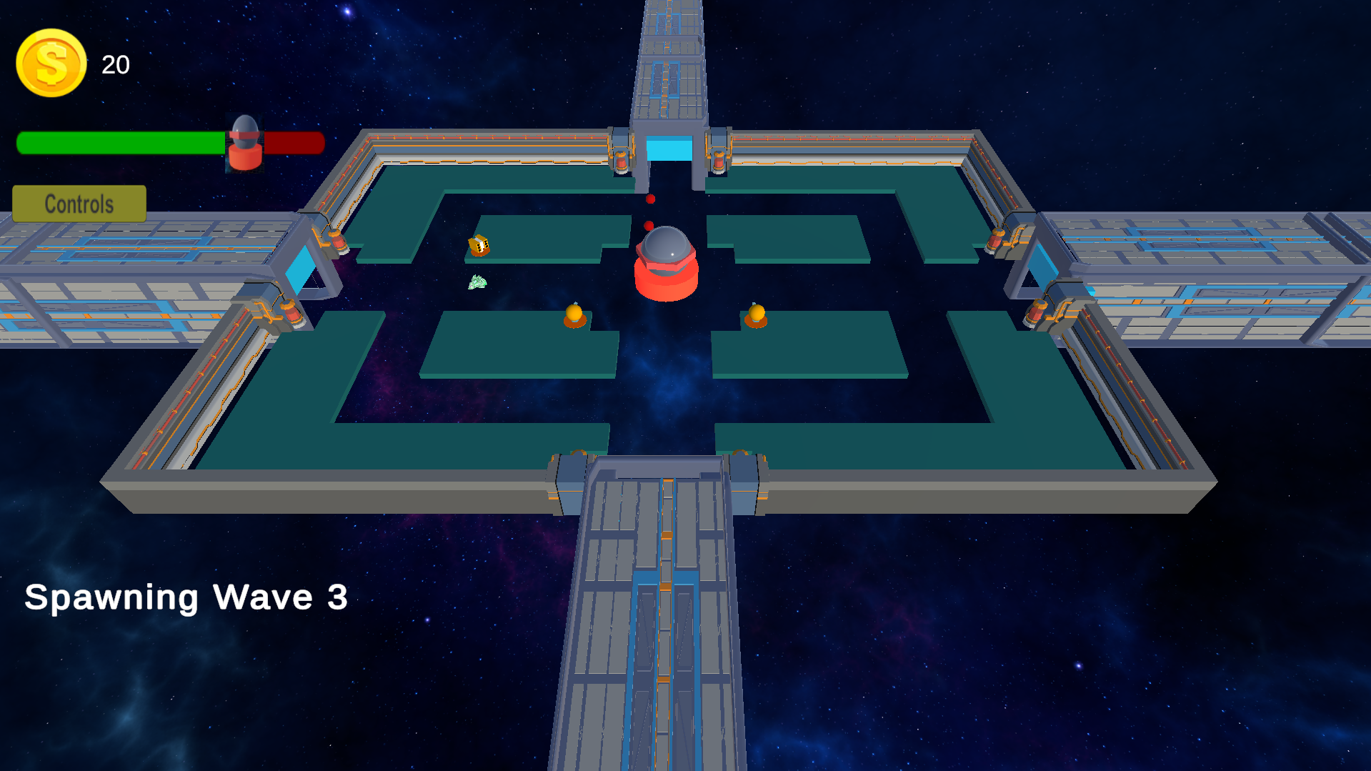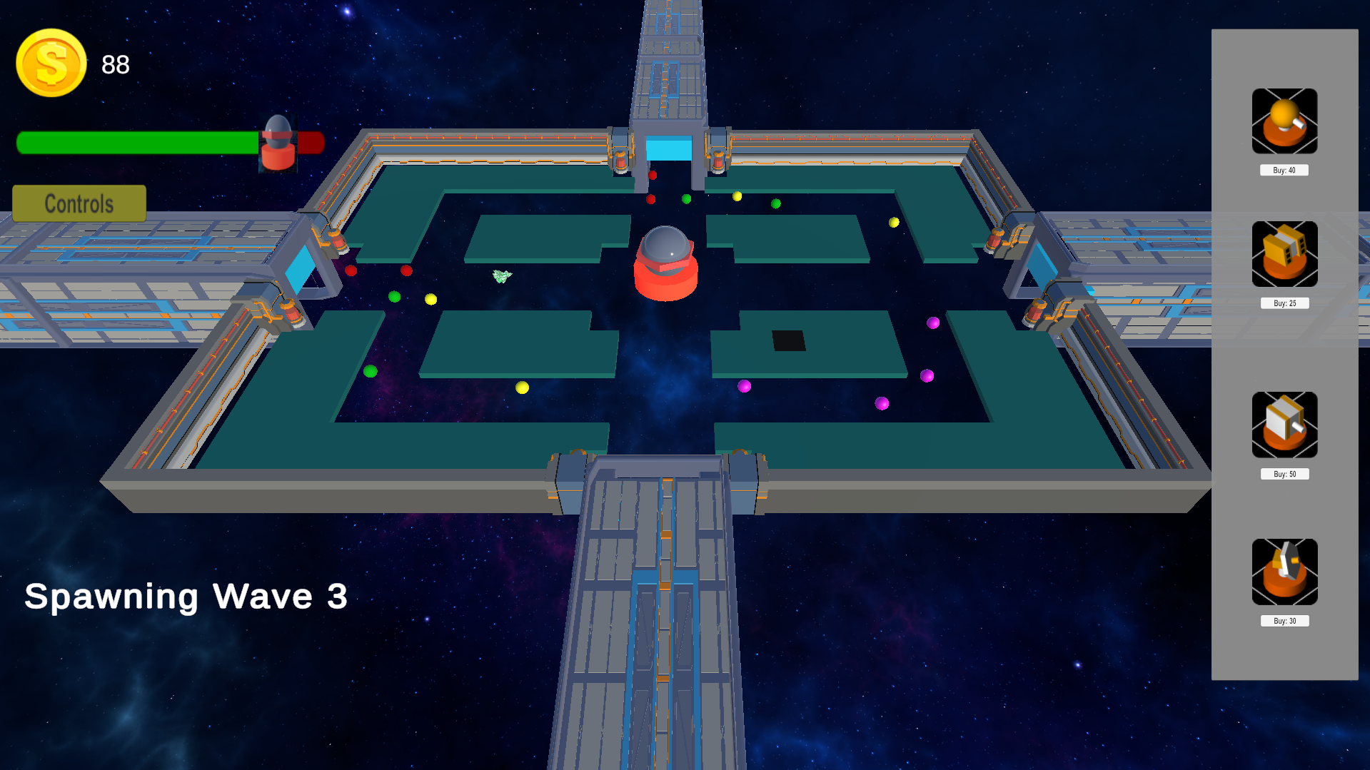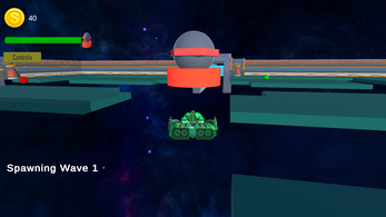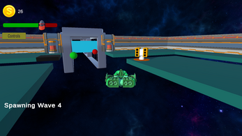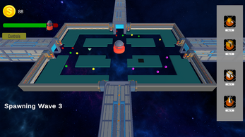 Defend the tower at the center of the map from different spherical enemies. Defeat them (by shooting them) to gain money. Use that money to place turrets and other support structures.